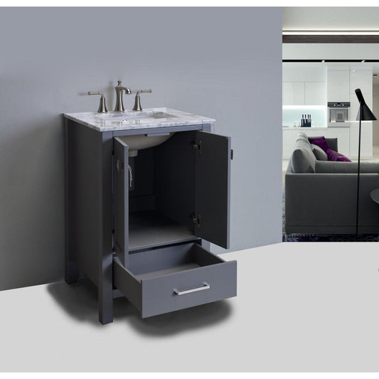 Eviva Happy 24" x 34" Gray Freestanding Bathroom Vanity With White Carrara Marble Top and Single Undermount Porcelain Sink