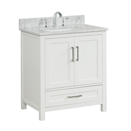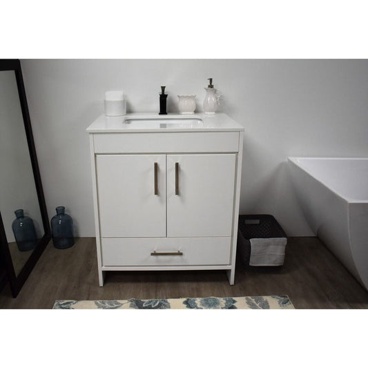 Volpa USA Capri 30" x 22" White Freestanding Modern Bathroom Vanity With Preinstalled Undermount Sink And White Microstone Top With Brushed Nickel Edge Handles