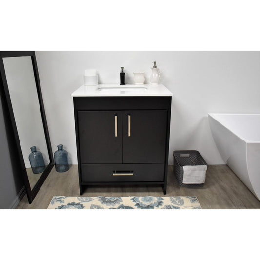 Volpa USA Capri 30" x 22" Black Freestanding Modern Bathroom Vanity With Preinstalled Undermount Sink And White Microstone Top With Brushed Nickel Edge Handles