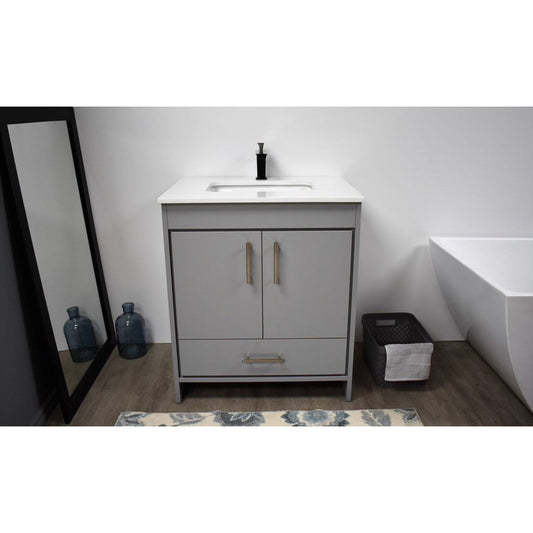 Volpa USA Capri 30" x 22" Gray Freestanding Modern Bathroom Vanity With Preinstalled Undermount Sink And White Microstone Top With Brushed Nickel Edge Handles
