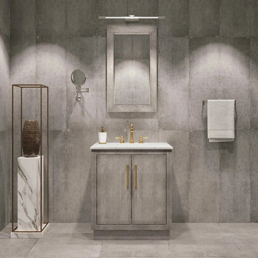 Water Creation Hugo 30" Single Sink Carrara White Marble Countertop Vanity with Satin Gold Pulls and Knobs with Gooseneck Faucet and Mirror