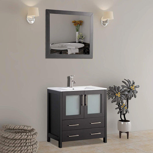 Vanity Art VA30 30" Single Espresso Freestanding Modern Bathroom Vanity Set With Integrated Ceramic Sink, Compact 1 Shelf, 2 Dovetail Drawers Cabinet And Mirror