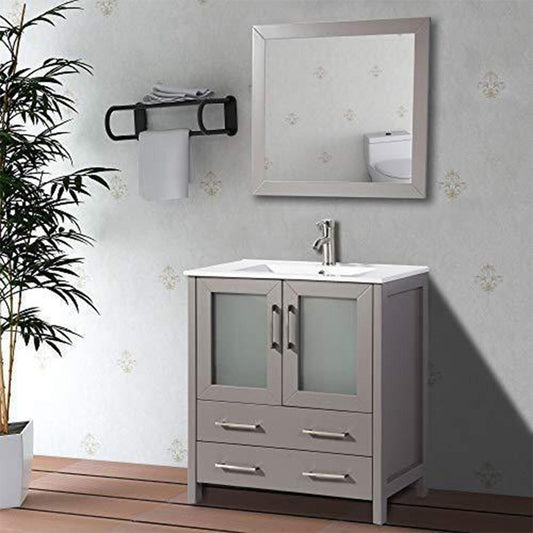Vanity Art VA30 30" Single Gray Freestanding Modern Bathroom Vanity Set With Integrated Ceramic Sink, Compact 1 Shelf, 2 Dovetail Drawers Cabinet And Mirror