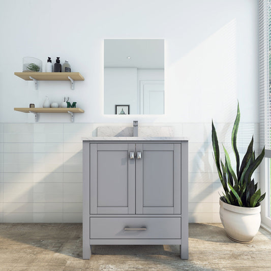 Duko Roma 30" Wooden Vanity Set With White Cararra Marble Tabletop, Rectangular Single Basin and Drawer Cabinet Gray