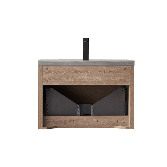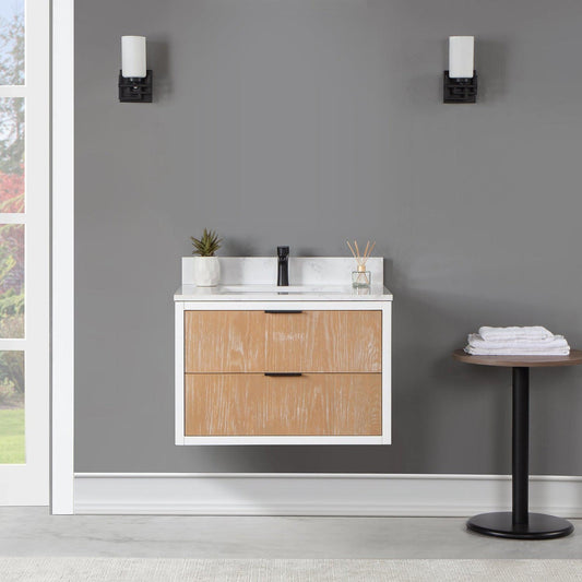 Altair Dione 30" Single Weathered Pine Wall-Mounted Bathroom Vanity Set With Aosta White Composite Stone Top, Single Rectangular Undermount Ceramic Sink, Overflow, and Backsplash