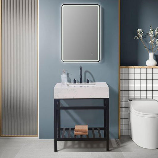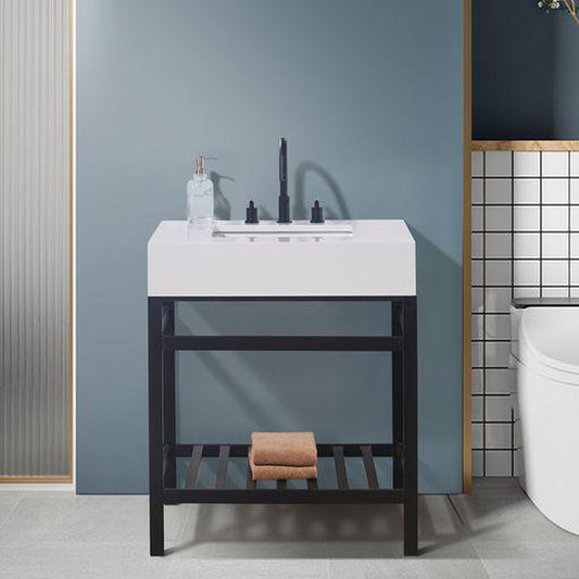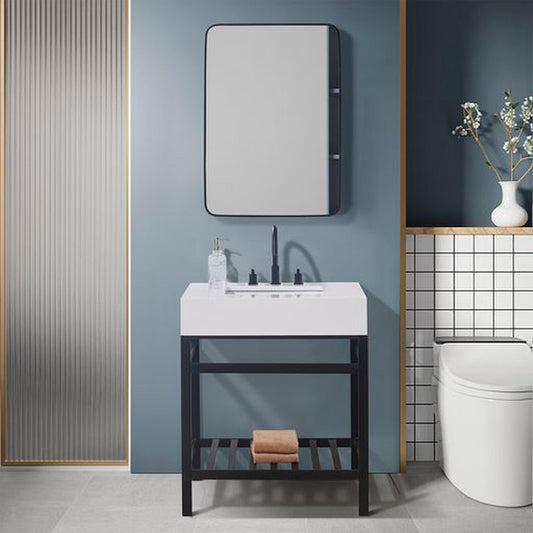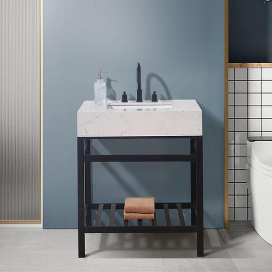 Altair Edolo 30" Matte Black Single Stainless Steel Bathroom Vanity Set Console With Snow White Stone Top, Single Rectangular Undermount Ceramic Sink, and Safety Overflow Hole