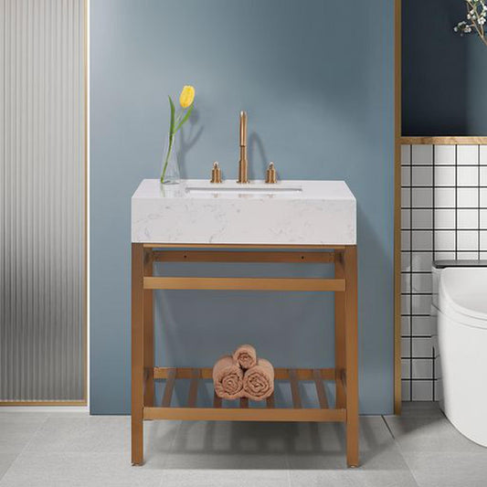 Altair Merano 30" Brushed Gold Single Stainless Steel Bathroom Vanity Set Console With Aosta White Stone Top, Single Rectangular Undermount Ceramic Sink, and Safety Overflow Hole