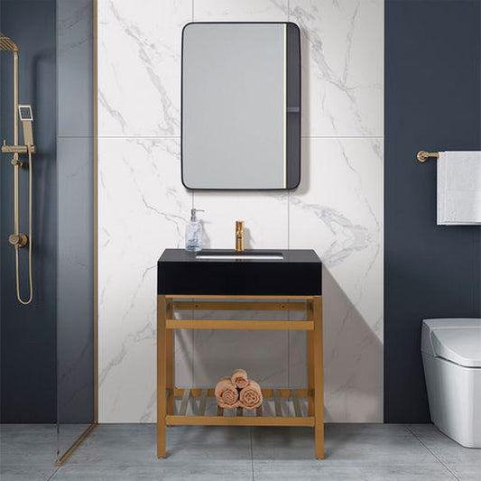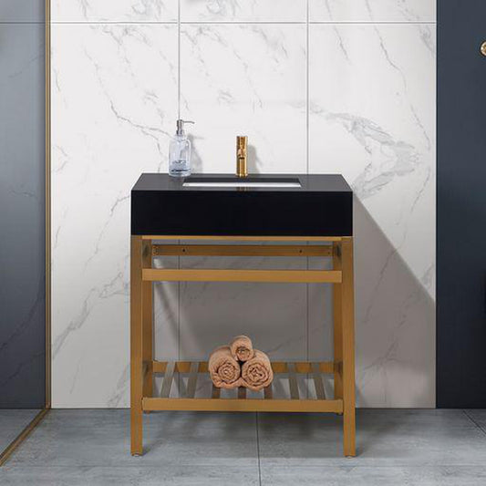 Altair Nauders 30" Brushed Gold Single Stainless Steel Bathroom Vanity Set Console With Imperial Black Stone Top, Single Rectangular Undermount Ceramic Sink, and Safety Overflow Hole