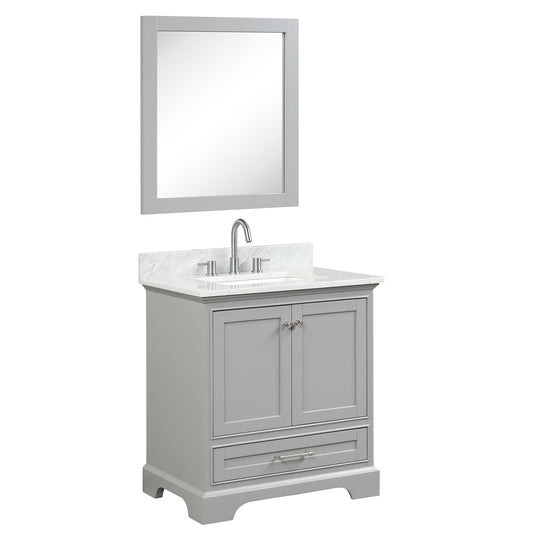 Bemma Design Terra 30" Graywash Solid Wood Freestanding Bathroom Vanity With Single 1-Hole Italian Carra Marble Vanity Top, Rectangle Undermount Sink and Brushed Nickel Trim
