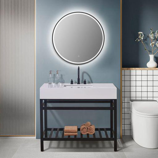 Altair Edolo 42" Matte Black Single Stainless Steel Bathroom Vanity Set Console With Mirror, Snow White Stone Top, Single Rectangular Undermount Ceramic Sink, and Safety Overflow Hole