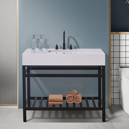 Altair Edolo 42" Matte Black Single Stainless Steel Bathroom Vanity Set Console With Snow White Stone Top, Single Rectangular Undermount Ceramic Sink, and Safety Overflow Hole