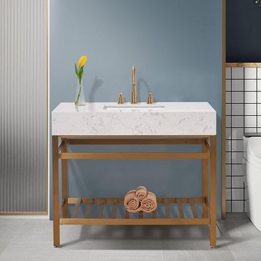 Altair Merano 42" Brushed Gold Single Stainless Steel Bathroom Vanity Set Console With Aosta White Stone Top, Single Rectangular Undermount Ceramic Sink, and Safety Overflow Hole