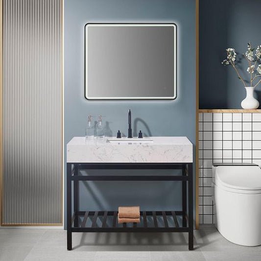 Altair Merano 42" Matte Black Single Stainless Steel Bathroom Vanity Set Console With Aosta White Stone Top, Single Rectangular Undermount Ceramic Sink, and Safety Overflow Hole