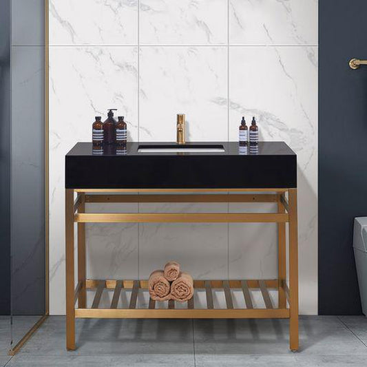 Altair Nauders 42" Brushed Gold Single Stainless Steel Bathroom Vanity Set Console With Imperial Black Stone Top, Single Rectangular Undermount Ceramic Sink, and Safety Overflow Hole