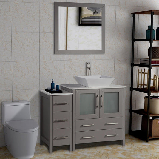 Vanity Art Ravenna 42" Single Gray Freestanding Vanity Set With White Engineered Marble Top, Ceramic Vessel Sink, 1 Side Cabinet and Mirror