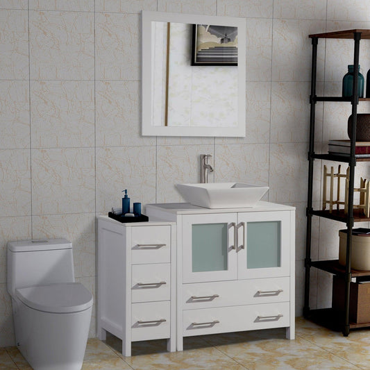 Vanity Art Ravenna 42" Single White Freestanding Vanity Set With White Engineered Marble Top, Ceramic Vessel Sink, 1 Side Cabinet and Mirror