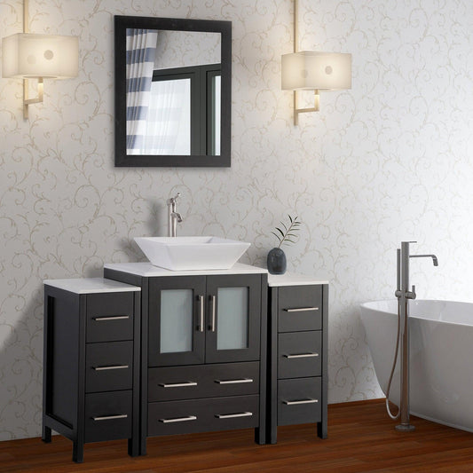 Vanity Art Ravenna 48" Single Espresso Freestanding Vanity Set With White Engineered Marble Top, Ceramic Vessel Sink, 2 Side Cabinet and Mirror
