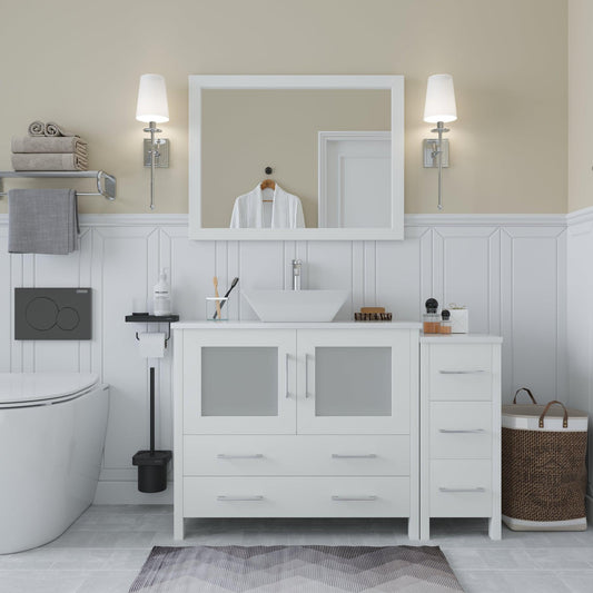 Vanity Art Ravenna 48" Single White Freestanding Vanity Set With White Engineered Marble Top, Ceramic Vessel Sink, 1 Side Cabinet and Mirror