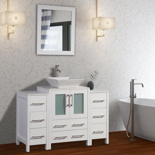 Vanity Art Ravenna 48" Single White Freestanding Vanity Set With White Engineered Marble Top, Ceramic Vessel Sink, 2 Side Cabinet and Mirror