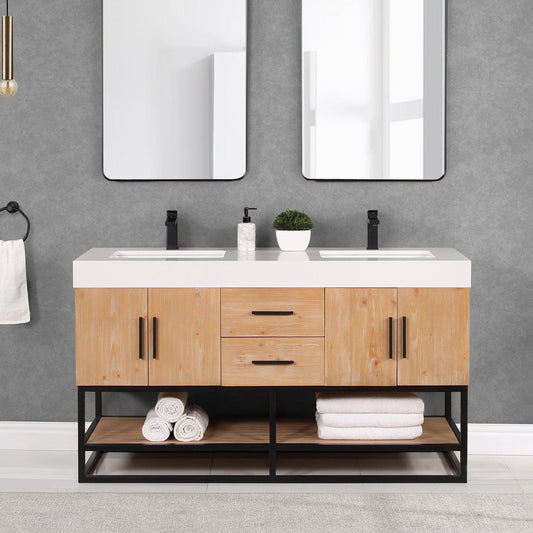 Altair Bianco 60" Light Brown Freestanding Double Bathroom Vanity Set With Matte Black Support Base, White Composite Stone Top, Two Rectangular Undermount Ceramic Sinks, and Overflow