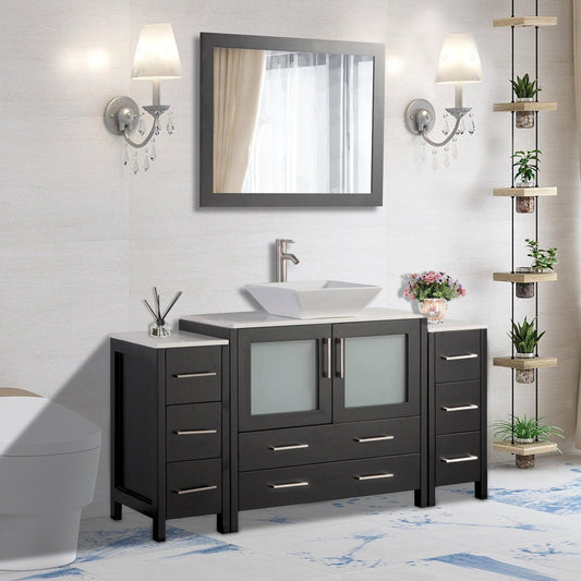 Vanity Art Ravenna 60" Single Espresso Freestanding Vanity Set With White Engineered Marble Top, Ceramic Vessel Sink, 2 Side Cabinets and Mirror