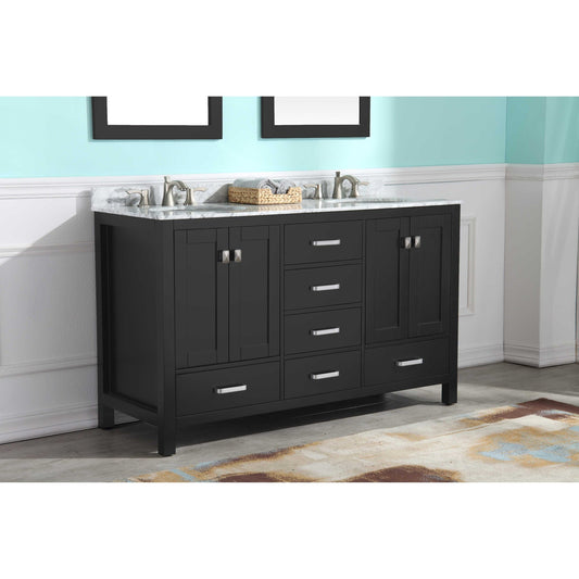 ANZZI Chateau Series 60" x 36" Rich Black Solid Wood Bathroom Vanity With White Carrara Marble Countertop, Basin Sink and Mirror