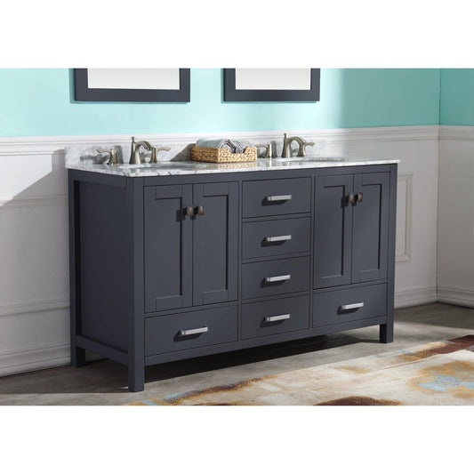 ANZZI Chateau Series 60" x 36" Rich Gray Solid Wood Bathroom Vanity With White Carrara Marble Countertop, Basin Sink and Mirror