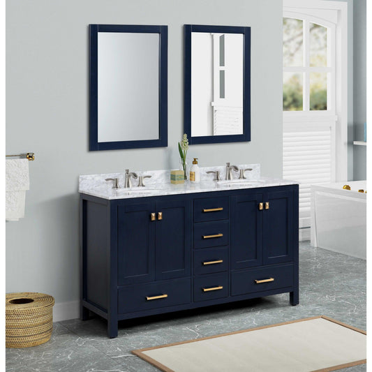 ANZZI Chateau Series 60" x 36" Navy Blue Solid Wood Bathroom Vanity With White Carrara Marble Countertop, Basin Sink and Mirror