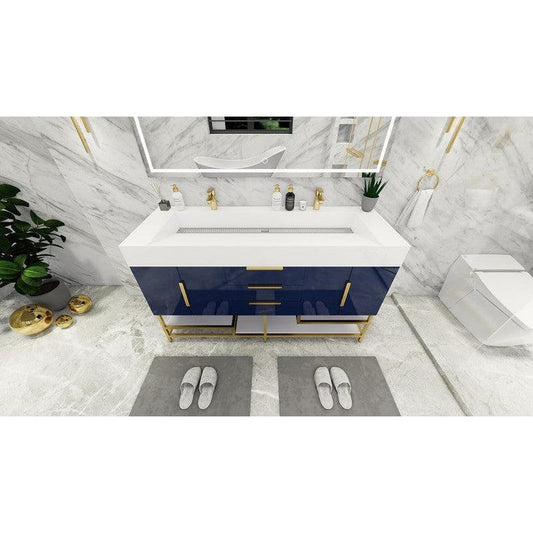 Moreno Bath Bethany 60" High Gloss Night Blue Freestanding Vanity With Double Reinforced White Acrylic Sinks