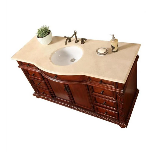 Silkroad Exclusive 60" Single Sink Red Chestnut Bathroom Vanity With Crema Marfil Marble Countertop and White Ceramic Undermount Sink