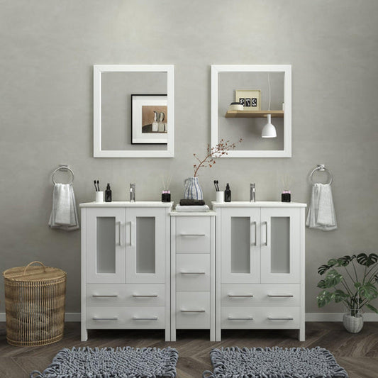 Vanity Art Brescia 60" Double White Freestanding Vanity Set With Integrated Ceramic Sink, 1 Side Cabinet and 2 Mirrors