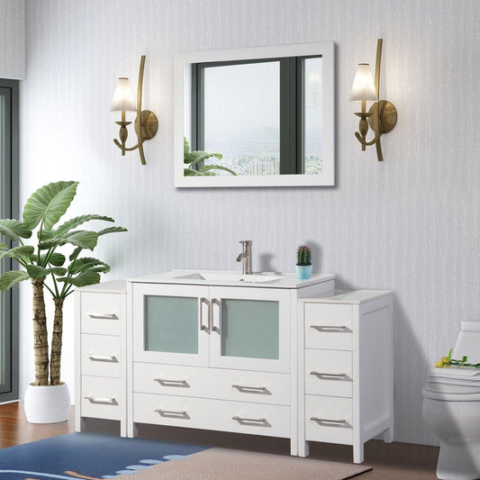 Vanity Art Brescia 60" Single White Freestanding Modern Bathroom Vanity Set With Integrated Ceramic Sink, 2 Side Cabinet and Mirror