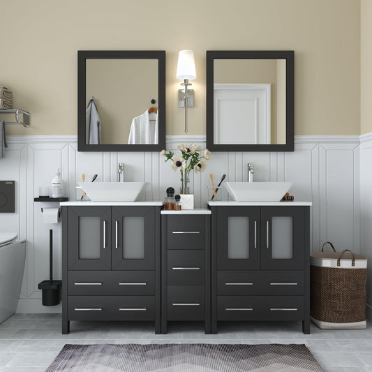 Vanity Art Ravenna 60" Double Espresso Freestanding Vanity Set With White Engineered Marble Top, 2 Ceramic Vessel Sinks, 1 Side Cabinet and 2 Mirrors