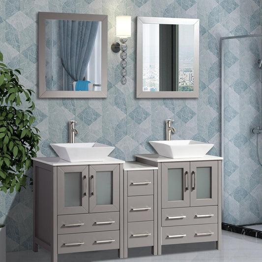 Vanity Art Ravenna 60" Double Gray Freestanding Vanity Set With White Engineered Marble Top, 2 Ceramic Vessel Sinks, 1 Side Cabinet and 2 Mirrors