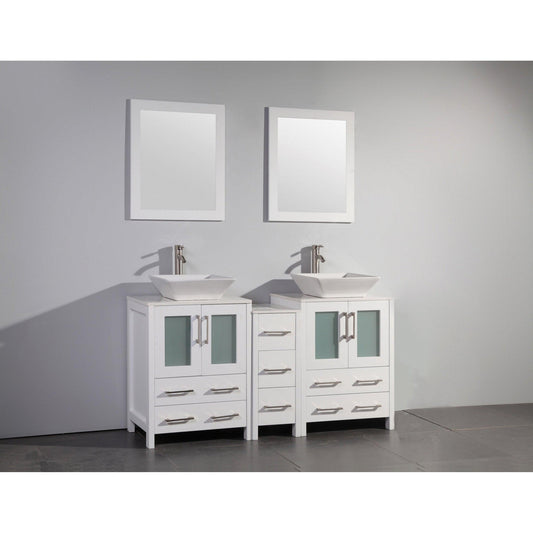 Vanity Art Ravenna 60" Double White Freestanding Vanity Set With White Engineered Marble Top, 2 Ceramic Vessel Sinks, 1 Side Cabinet and 2 Mirrors