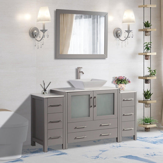 Vanity Art Ravenna 60" Single Gray Freestanding Vanity Set With White Engineered Marble Top, Ceramic Vessel Sink, 2 Side Cabinets and Mirror