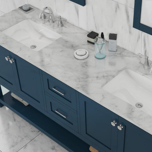 Alya Bath Wilmington 72" Double Blue Freestanding Bathroom Vanity With Carrara Marble Top, Ceramic Sink and Wall Mounted Mirror