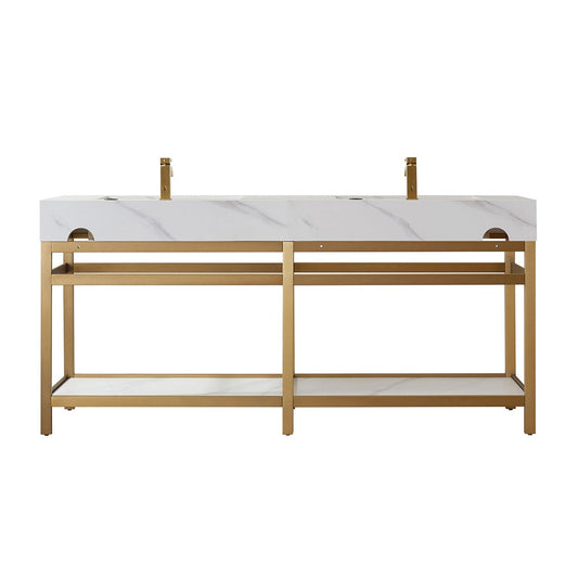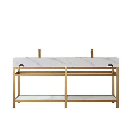 Vinnova Bilbao 72" Double Vanity With Brushed Gold Stainless Steel Bracket Match With Snow Mountain White Stone Countertop Without Mirror