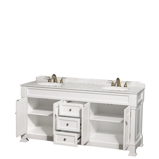 Wyndham Collection Andover 72" Double Bathroom Vanity in White With White Carrara Marble Countertop & Undermount Oval Sink