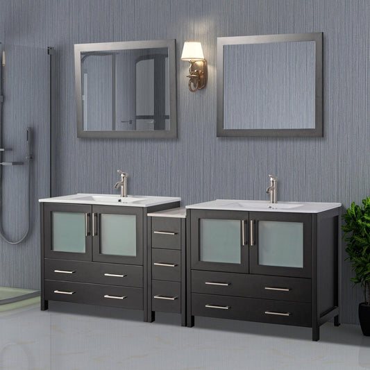 Vanity Art Brescia 84" Double Espresso Freestanding Modern Bathroom Vanity Set With Integrated Ceramic Sink, 1 Side Cabinet and 2 Mirrors