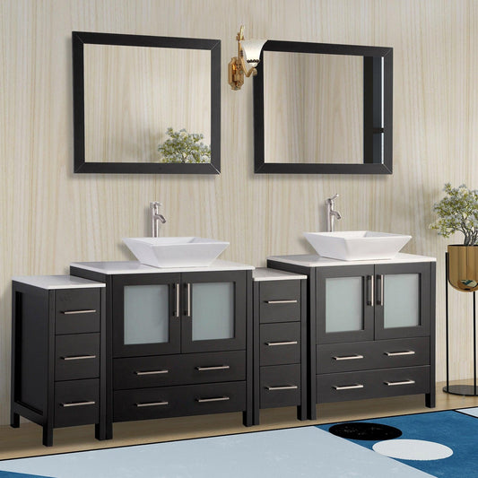 Vanity Art Ravenna 84" Double Espresso Freestanding Vanity Set With White Engineered Marble Top, 2 Ceramic Vessel Sinks, 1 Side Cabinet and 2 Mirrors