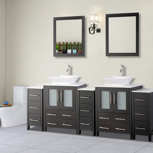 Vanity Art Ravenna 84" Double Espresso Freestanding Vanity Set With White Engineered Marble Top, 2 Ceramic Vessel Sinks, 3 Side Cabinets and 2 Mirrors
