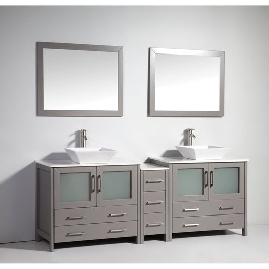 Vanity Art Ravenna 84" Double Gray Freestanding Vanity Set With White Engineered Marble Top, 2 Ceramic Vessel Sinks, 1 Side Cabinet and 2 Mirrors