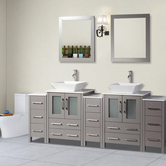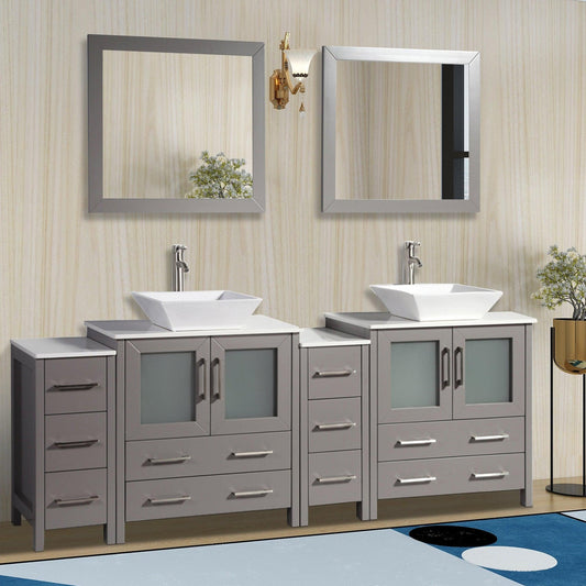 Vanity Art Ravenna 84" Double Gray Freestanding Vanity Set With White Engineered Marble Top, 2 Ceramic Vessel Sinks, 3 Side Cabinets and 2 Mirrors