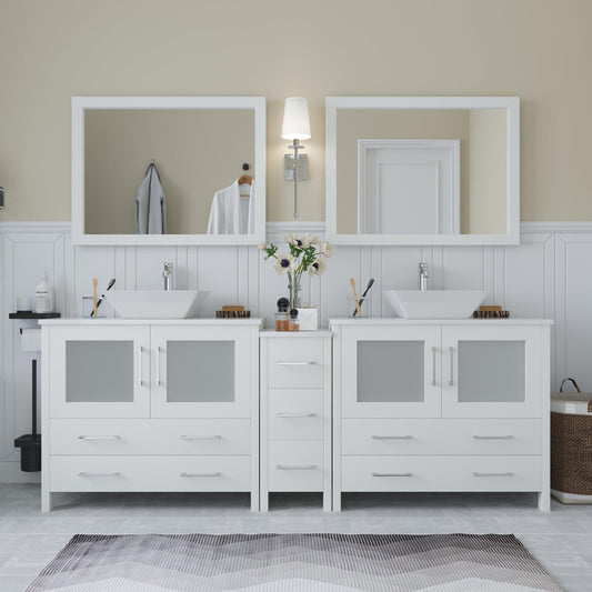 Vanity Art Ravenna 84" Double White Freestanding Vanity Set With White Engineered Marble Top, 2 Ceramic Vessel Sinks, 3 Side Cabinets and 2 Mirrors