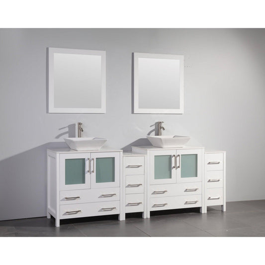 Vanity Art Ravenna 84" Double White Freestanding Vanity Set With White Engineered Marble Top, 2 Ceramic Vessel Sinks, 1 Side Cabinet and 2 Mirrors