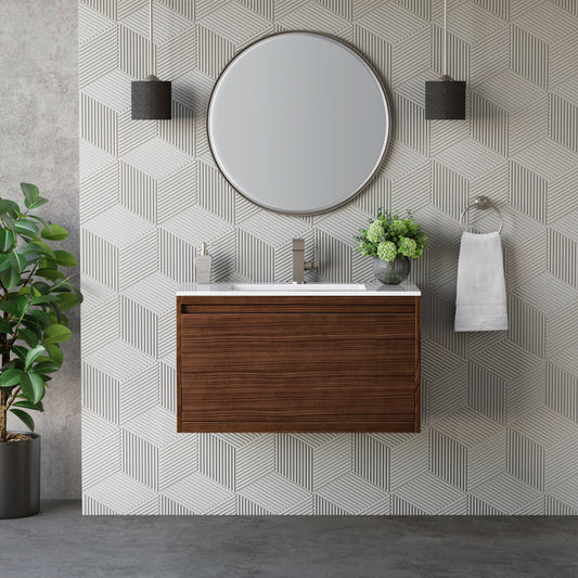 James Martin Vanities Mantova 35.4" Mid-Century Walnut Single Vanity With Glossy White Composite Stone Top