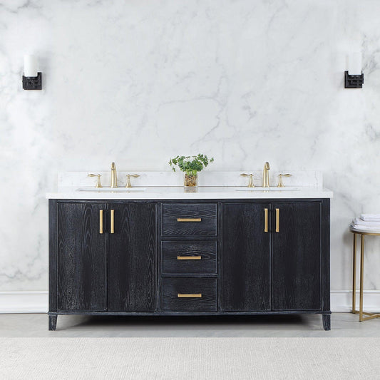 Altair Novago 72" Weathered Pine Freestanding Double Bathroom Vanity Set With Aosta White Composite Stone Top, Double Rectangular Drop-In Black Farmhouse Ceramic Sinks, Overflow, and Backsplash