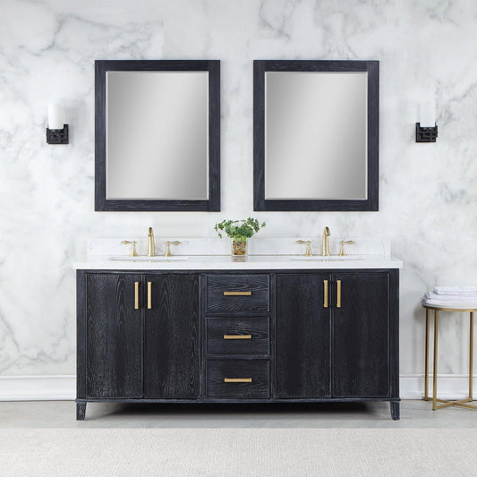 Altair Novago 72" Weathered Pine Freestanding Double Bathroom Vanity Set With Mirror, Aosta White Composite Stone Top, Double Rectangular Drop-In Black Farmhouse Ceramic Sinks, Overflow, and Backsplash