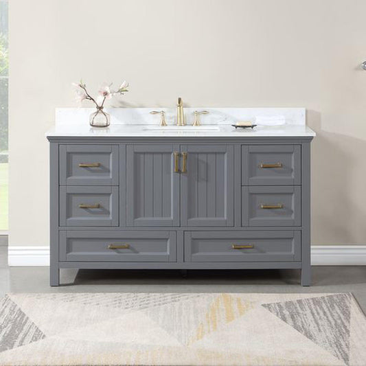 Altair Isla 60" Single Gray Freestanding Bathroom Vanity Set With Aosta White Composite Stone Top, Rectangular Undermount Ceramic Sink, and Overflow